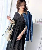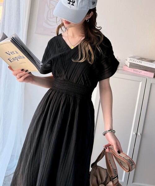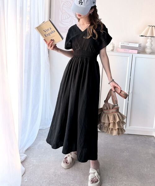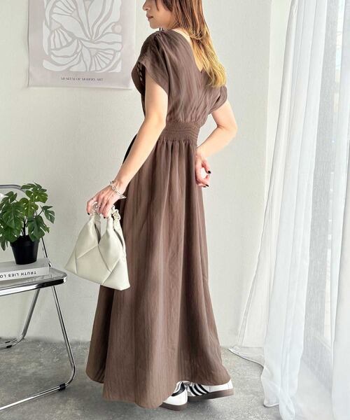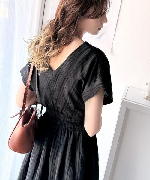 商品名:【予約受付中】大人の抜け感エレガント。シアーストライプ素材ウエストシャーリングVネックロングワンピース